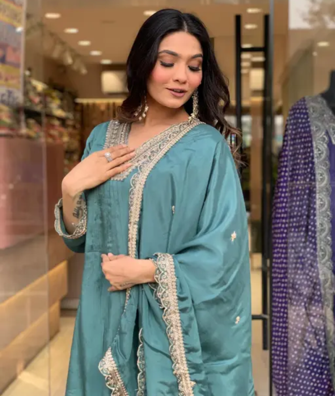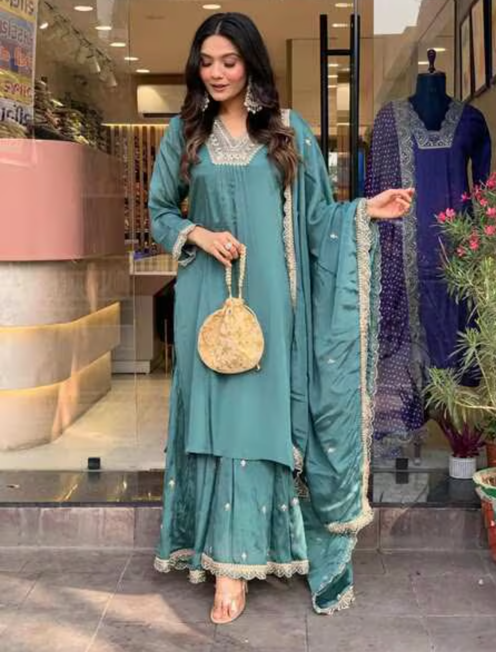 Elevate your ethnic wardrobe with our Fidhara Women Stylish Sharara set. This trendy outfit features a beautifully designed top paired with a flowy sharara bottom, perfect for any festive occasion or special event. Made from high-quality fabric, this set is comfortable to wear and will make you stand out in the crowd. Shop now and add this stylish ensemble to your collection.